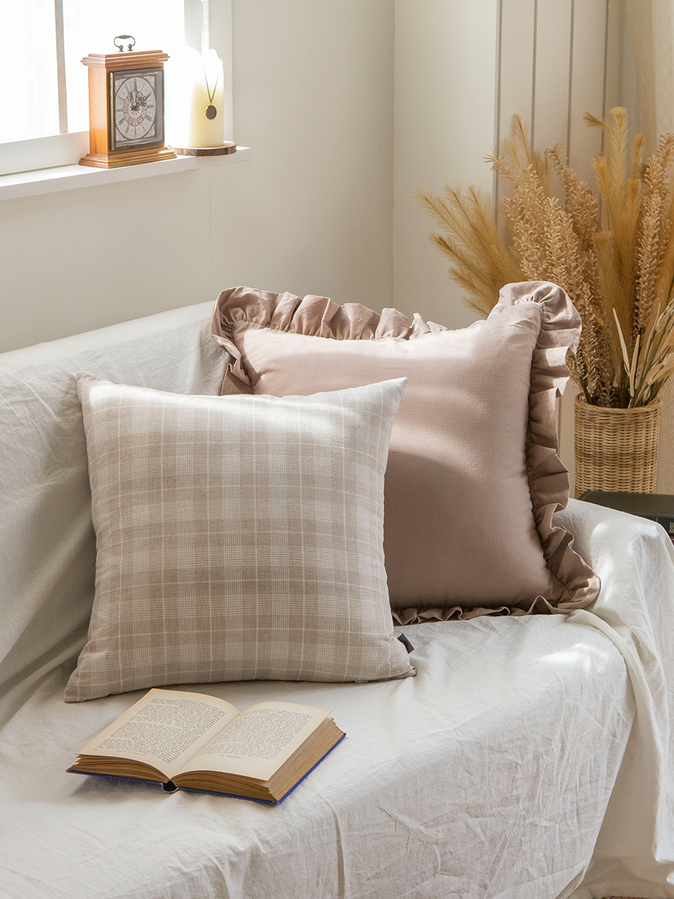 라느 오트밀 체크 쿠션커버